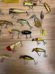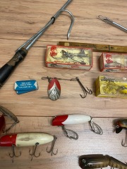 Mixed lot of fishing lures, fishing gaff, fish hook remover, and floating fish knife.